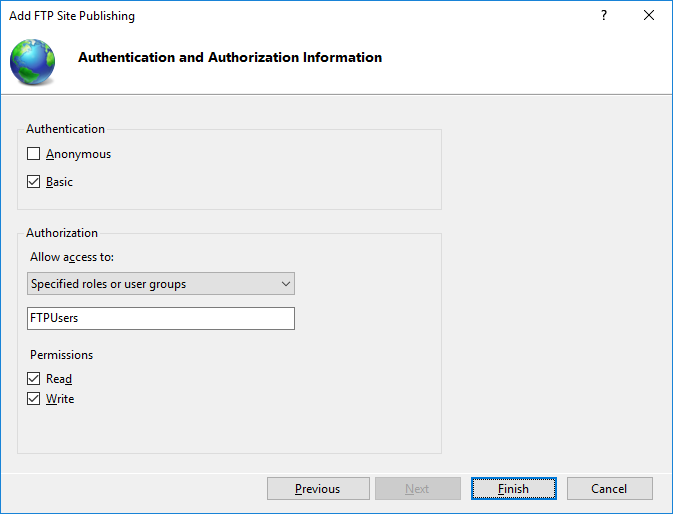 - On Hallmark and Dominance Information pace, select Basic authentication and brand sure Anonymous hallmark is not selected. Select which users (Windows accounts) you permit to connect to the server with what permissions. You can choose All users or select but some. Practice not select Anonymous users.